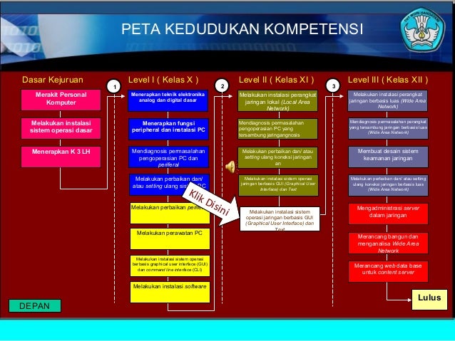 - 2. PETA KEDUDUKAN KOMPETENSIDasar Kejuruan Level I ( Kelas X ) Level II ( Kelas XI ) Level III ( Kelas XII ) 1 2 3 Merakit Personal Menerapkan teknik elektronika Melakukan instalasi perangkat Melakukan instalasi perangkat Komputer analog dan digital dasar jaringan lokal (Local Area jaringan berbasis luas (Wide Area Network) Network) Melakukan instalasi Menerapkan fungsi Mendiagnosis permasalahan Mendiagnosis permasalahan perangkat pengoperasian PC yang yang tersambung jaringan berbasis luas sistem operasi dasar peripheral dan instalasi PC (Wide Area Network) tersambung jaringangnosis Menerapkan K 3 LH Mendiagnosis permasalahan Melakukan perbaikan dan/ atau Membuat desain sistem pengoperasian PC dan setting ulang koneksi jaringan keamanan jaringan periferal an Melakukan perbaikan dan/ Melakukan instalasi sistem operasi Melakukan perbaikan dan/ atau setting jaringan berbasis GUI (Graphical User ulang koneksi jaringan berbasis luas atau setting ulang sistem PC Klik Interface) dan Text (Wide Area Network) D Melakukan perbaikan periferal isi ni Melakukan instalasi sistem Mengadministrasi server dalam jaringan operasi jaringan berbasis GUI (Graphical User Interface) dan Text Melakukan perawatan PC Merancang bangun dan menganalisa Wide Area Network Melakukan instalasi sistem operasi berbasis graphical user interface (GUI) Merancang web data base dan command line interface (CLI) untuk content server Melakukan instalasi software LulusDEPAN