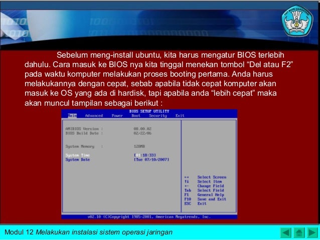 - 4. Sebelum meng-install ubuntu, kita harus mengatur BIOS terlebih dahulu. Cara masuk ke BIOS nya kita tinggal menekan tombol “Del atau F2” pada waktu komputer melakukan proses booting pertama. Anda harus melakukannya dengan cepat, sebab apabila tidak cepat komputer akan masuk ke OS yang ada di hardisk, tapi apabila anda “lebih cepat” maka akan muncul tampilan sebagai berikut :Modul 12 Melakukan instalasi sistem operasi jaringan