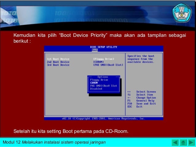 - 6. Kemudian kita pilih “Boot Device Priority” maka akan ada tampilan sebagai berikut : Setelah itu kita setting Boot pertama pada CD-Room.Modul 12 Melakukan instalasi sistem operasi jaringan