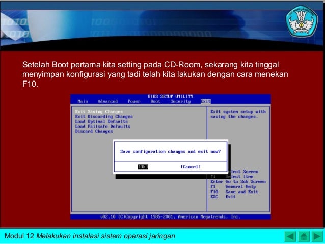 - 7. Setelah Boot pertama kita setting pada CD-Room, sekarang kita tinggal menyimpan konfigurasi yang tadi telah kita lakukan dengan cara menekan F10.Modul 12 Melakukan instalasi sistem operasi jaringan