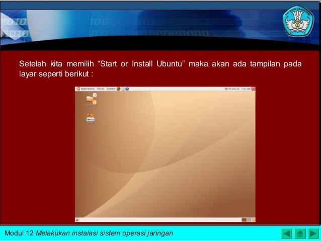 - 8. Setelah konfigurasi pada BIOS kita simpan, maka akan muncul tampilan pada layar sebagai berikut : Kemudian pilih “Start or Install Ubuntu” untuk memulai menginstall.Modul 12 Melakukan instalasi sistem operasi jaringan
